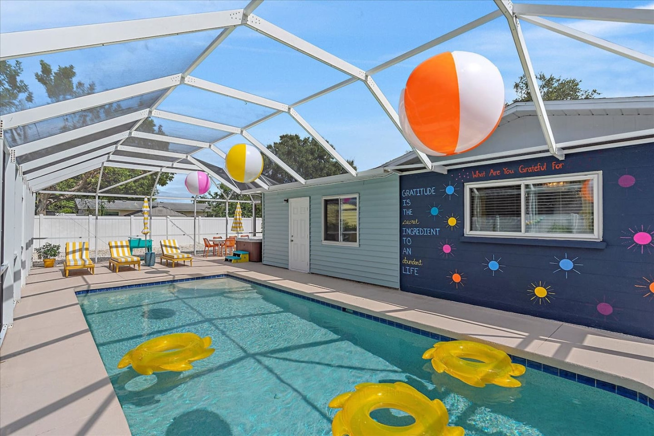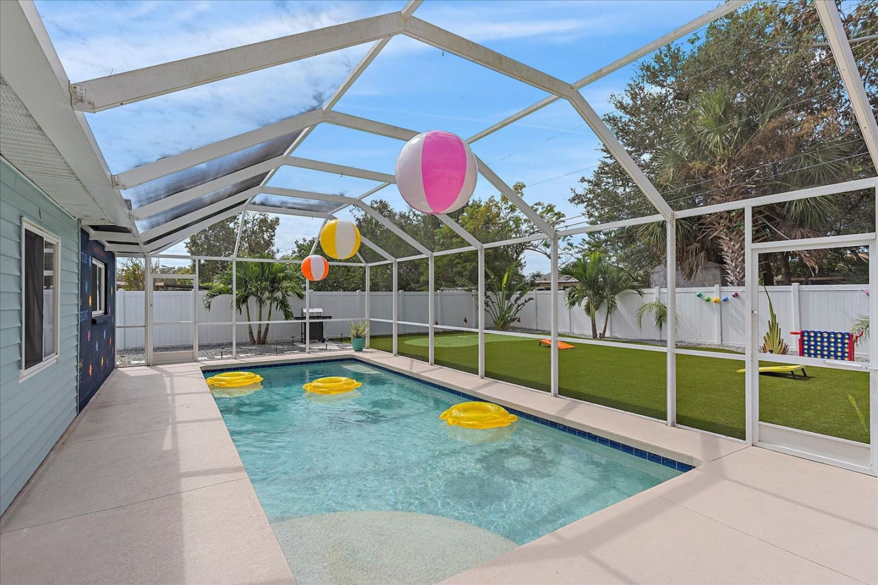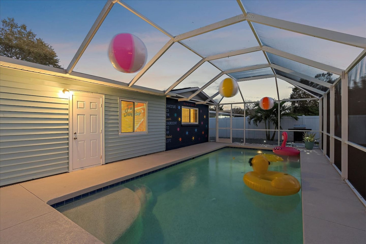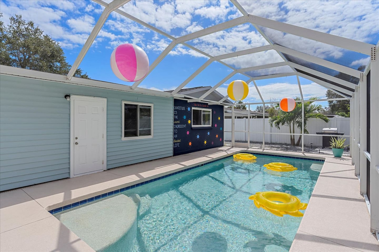 Escape the cold and dive into sunshine, sandy beaches, and breathtaking sunsets at this cheerful retreat! Perfect for family fun, this home features a heated pool, soothing hot tub, and plenty of space for games and laughter. Relax on inviting outdoor patios, soak up the warm Florida breeze, or make memories playing together indoors. With sun-filled days, cozy nights, and endless beach adventures, this is your ultimate getaway to recharge, reconnect, and celebrate life in style. The Sunshine House: 3 bedroom/2 bath Bedroom#1: King ensuite - King bed, ensuite with walk-in shower, and walk-in closet Bedroom#2: Queen room - queen bed, with full closet and dresser Bedroom#3: Bunk room - 2 sets of bunks, dresser, and full closet Hall Bathroom - full bathroom with tub to be shared by the rooms on that side of the house The Sunshine house also has a living room, game room, large kitchen, dining room, and laundry room is in the garage. Each room has a smart TV and FAST, FREE WiFi. Out back you will find the screened lanai which houses our inground heated pool, hot tub, dining area, lounge area and several murals perfect for those photo opps. Beyond the lanai you will find our fire pit set beneath the pergola. The putting green, the corn hole and our propane grill. The yellow shed is filled with beach supplies and pool gear. We want to lighten the load as you prepare for your trip. The home always has condiments and spices that we have ensured are safe for consumption. ITEMS WE PROVIDE: LINENS/TOWELS: Bath Towel - 1 per guest (1 extra per bathroom) Hand Towel - 1 per guest (1 extra in each shared bathroom) Wash cloths - 1 per guest Make-up removal wash cloths - 1 per adult guest (1 extra per bathroom) Beach towels - 1 per guest Clean bed linens, quilts, and pillows for each bed. An extra set of sheets and pillow will be provided for the trundle bed. HOUSE SUPPLIES/TOILETRIES: Complimentary Starter Supply 2 rolls of toilet paper per bathroom Shampoo/Conditioner/Shower Gel - dispensers in each bathroom Small trash bags - 3 per small can Hair Dryer 2 rolls of paper towels - 1 on 1 under sink A new kitchen sponge Travel size dish soap Dishwasher pods - 1 per night up to 7 nights Large trash bags - 1 per night up to 7 nights BEACH SUPPLIES: 1 beach umbrella 1 beach towel per guest 1 cooler Beach chairs (minimum of 4) COFFEE STATION: Complimentary starter supply K-Cups Small package of ground coffee Creamers Sugar We are 6 miles to ANNA MARIA island, 7 miles to BRADENTON BEACH, and only 18 miles to SIESTA KEY! IMG less than 3 miles away. Close to State parks, historical parks, museums, fishing and boating. We have a full guest manual in the home, with all the information you will need for our home and brochures and maps of the area, that should give you plenty to explore, if you choose to venture away from the home. Guests have full access to the entire house. We have 2 owners closets. We communicate strictly through your booking platform so please have the app downloaded on your phone. We are always available for anything you might need. Functional smoke detectors, fire extinguishers, and first aid kit in the house. Hospitals are minutes away if needed. Please message me with any questions! Enjoy everything in the surrounding area! Downtown Bradenton 2.5 miles Holmes Beach 6 miles Anna Maria Island 6 miles IMG Academy 2.3 miles Publix 3.1 miles Robinson's Preserve 5 miles Manatee Memorial Hospital 3 miles Dunkin 2.1 miles Lido Key & Downtown Sarasota 15.1 miles Siesta Key 19 miles SRX Airport 9 miles This is a free trolley that goes up and down Anna maria island and a bus comes to every stop every 20 minutes. There are 26 stops in total on the island so you can get anywhere. FREE! If you want to enjoy the sights on your way to the island find all the information to the Gulf Island Ferry in our guest manual. You will ride along the to the island while enjoying the sights. Download the "mystop" app and click on manatee county to get real time updates on bus expected arrival times. If staying in the area, we do suggest renting a vehicle. Please note we do have cameras ONLY outside for everyone's safety. These cameras are located by the front door and around the back of the house. They will record audio and video. Please note we do not offer refunds of any kind for any reason if it’s outside of the cancellation policy in place. Your booking platform offers trip insurance for each reservation that must be purchased at the time of reservation. If you miss this opportunity, and want to guarantee the option to cancel outside the normal cancellation period, you will need to purchase private trip insurance.